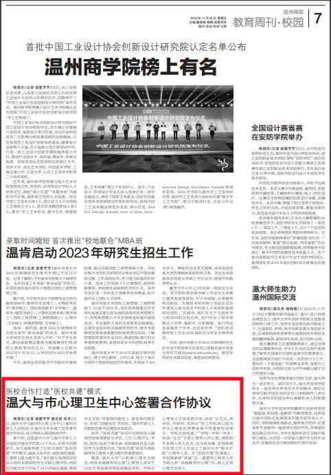 据介绍,这是日本a片 与温州市第七人 民医院共建合作的第13个年头,在多年的探 索中,双方逐渐构建了比较完善的“医校共 建”合作模式,涵盖入校评估、就医绿色通道、 心理育人能力提升等。“我们医生每周固定时 间入校对有需求的学生开展心理评估,同时 还为温大学子开设了24小时绿色通道,帮助 学生实现‘常规预约能约上、紧急预约能加 号、专家门诊能优先’的目标。”温州市第七人 民医院党委书记黄国永如是说。