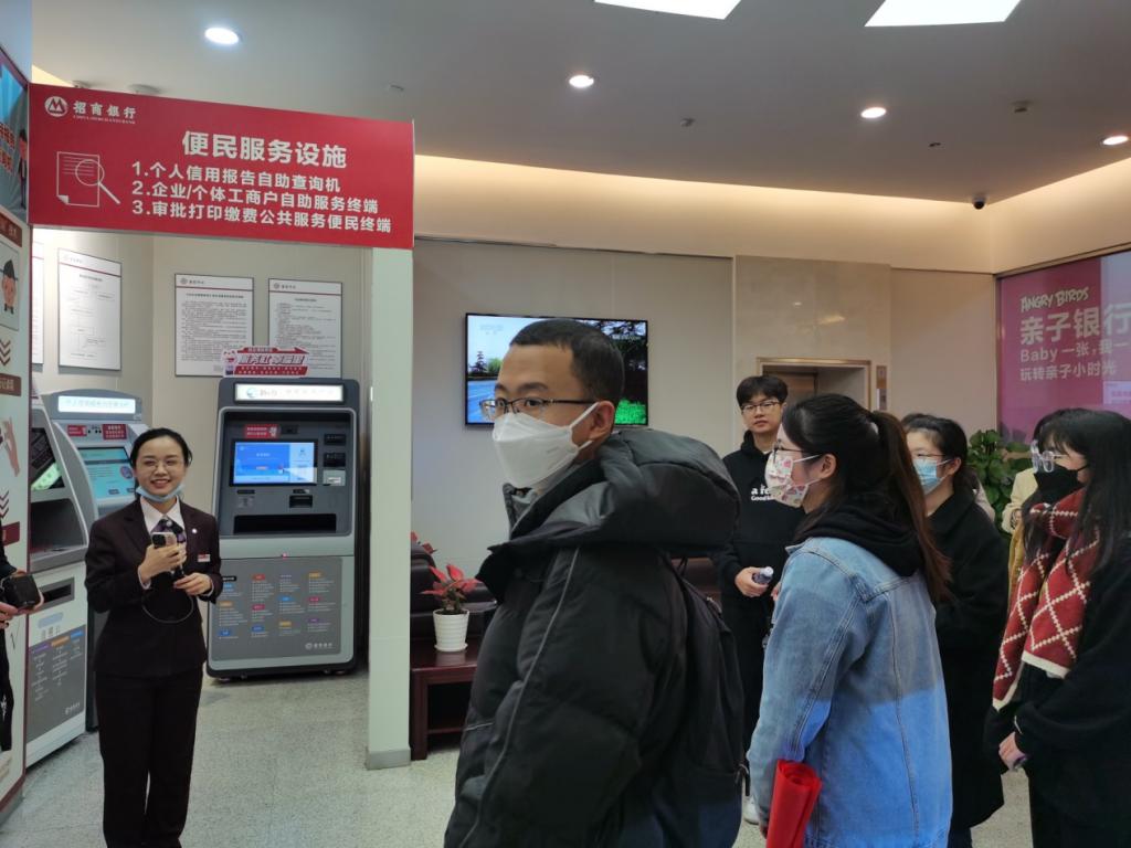为加强大学生的实地体验和参与感,在金融讲座结束后,大学生们参观了招商银行温州分行营业部,了解了银行网点大厅的整体布局,各个区域的功能,日常工作情况,业务办理流程等。