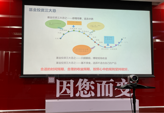 叶丹丹老师以提问的方式向大学生们介绍了银行的分类以及招商银行的基本情况。在投资理财方面,她以学生较为熟悉的余额宝、零钱通等平台引出主题,分别从银行客户的分级管理、理财产品的变化等方面讲述了行业的变化和发展。接着,为了让学生位更好地了解现如今投资市场的情况,叶老师展示了近年来各类理财产品的收益排名、波动情况以及各大银行理财产品投资情况的一些案例。随后,叶丹丹老师详细介绍了基金定投的方式、原则和基金投资的注意事项等。