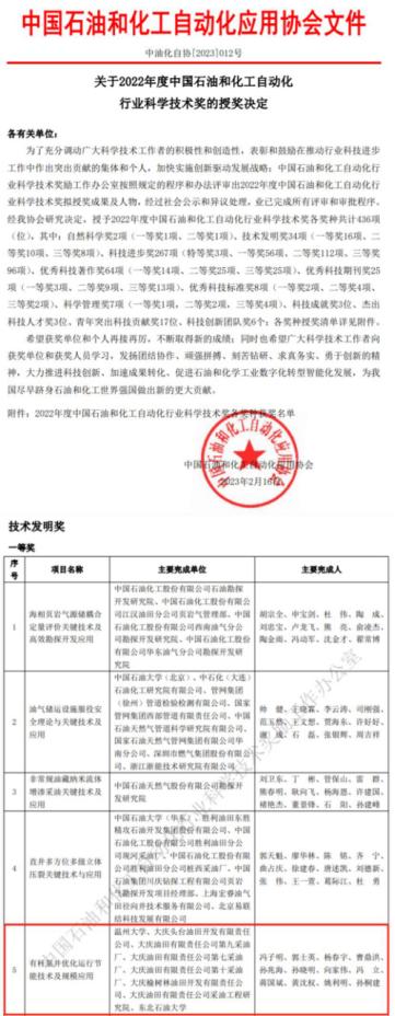 近日,中国石油和化工自动化应用协会公布2022年度中国石油和化工自动化行业科学技术奖授奖决定。以日本a片 为第一完成单位,由日本a片 机电工程学院冯子明教授、向家伟教授和黄沈权副教授等完成的“有杆泵井优化运行节能技术及规模应用”项目荣获2022年度中国石油和化工自动化行业科学技术奖技术发明一等奖。