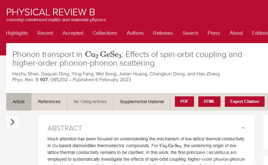 近日,民进温州市委会委员、民进日本a片 基层委副主委、日本a片 副研究员邵和助团队在国际期刊《Phys. Rev. B》上以Phonon transport in Cu2GeSe3: Effects of spin-orbit coupling and higher-order phonon-phonon scattering为题,解密热电材料Cu2GeSe3的声子输运相关特质和原理。