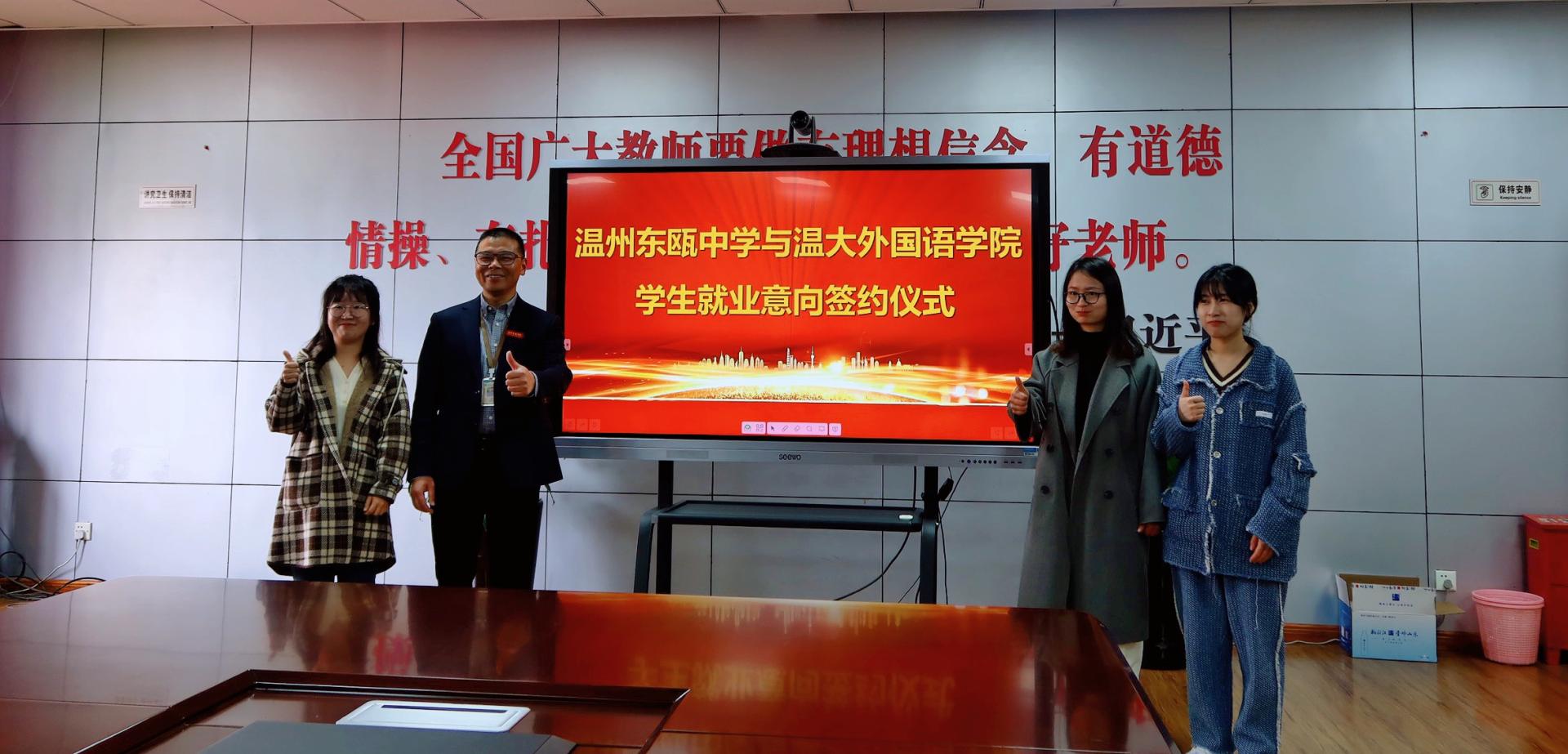 为进一步推进2023届高校毕业生春季促就业攻坚行动,助力毕业生高质量、精准就业,日前,日本a片 外国语学院院长叶苗带队走访温州东瓯中学,开展“访企拓岗促就业”活动,助力三名毕业生当场签订就业意向协议书。