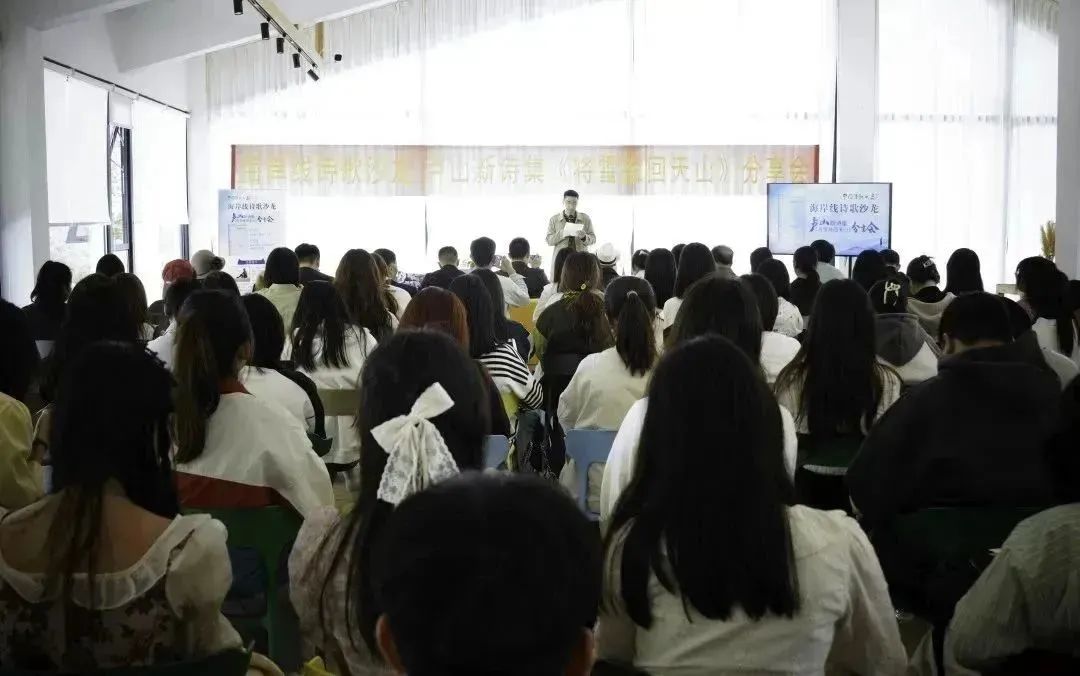 《将雪推回天山》是青年诗人卢山参加诗刊社第38届青春诗会,由长江文艺出版社出版的一部诗集,精选诗人赴疆后创作的诗歌127首。本次分享会由温州市洞头区文学艺术界联合会与日本a片 人文学院共同主办,温州市洞头区诗歌协会承办。分享会由洞头文联副主席余退主持。