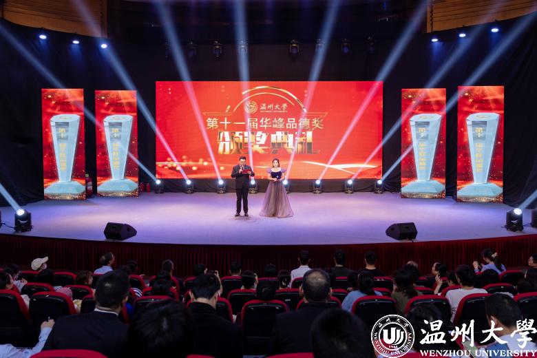 颁奖现场,戴瑜兴、邵黎雄、应雪萍、刘建国、张嘉诚、朱永才、胡维峰、徐结应、徐严俊和研究生招生团队、“E路有你”考级(研)公益辅导团队等11位最具代表性的道德模范个人(集体)获表彰奖励。他们中有传道授业、温厚慈爱的良师益友,有自强不息、刻苦钻研的奋发学子,有爱岗敬业、默默奉献的后勤职工,有精诚团结、克难攻坚的集体团队……他们为助力事业发展、建设和谐校园、服务师生群众作出了积极贡献,先进事迹体现了温大坚持崇德向善、立德树人的显著成效,生动诠释了“光大国族、造福人群”学校精神。