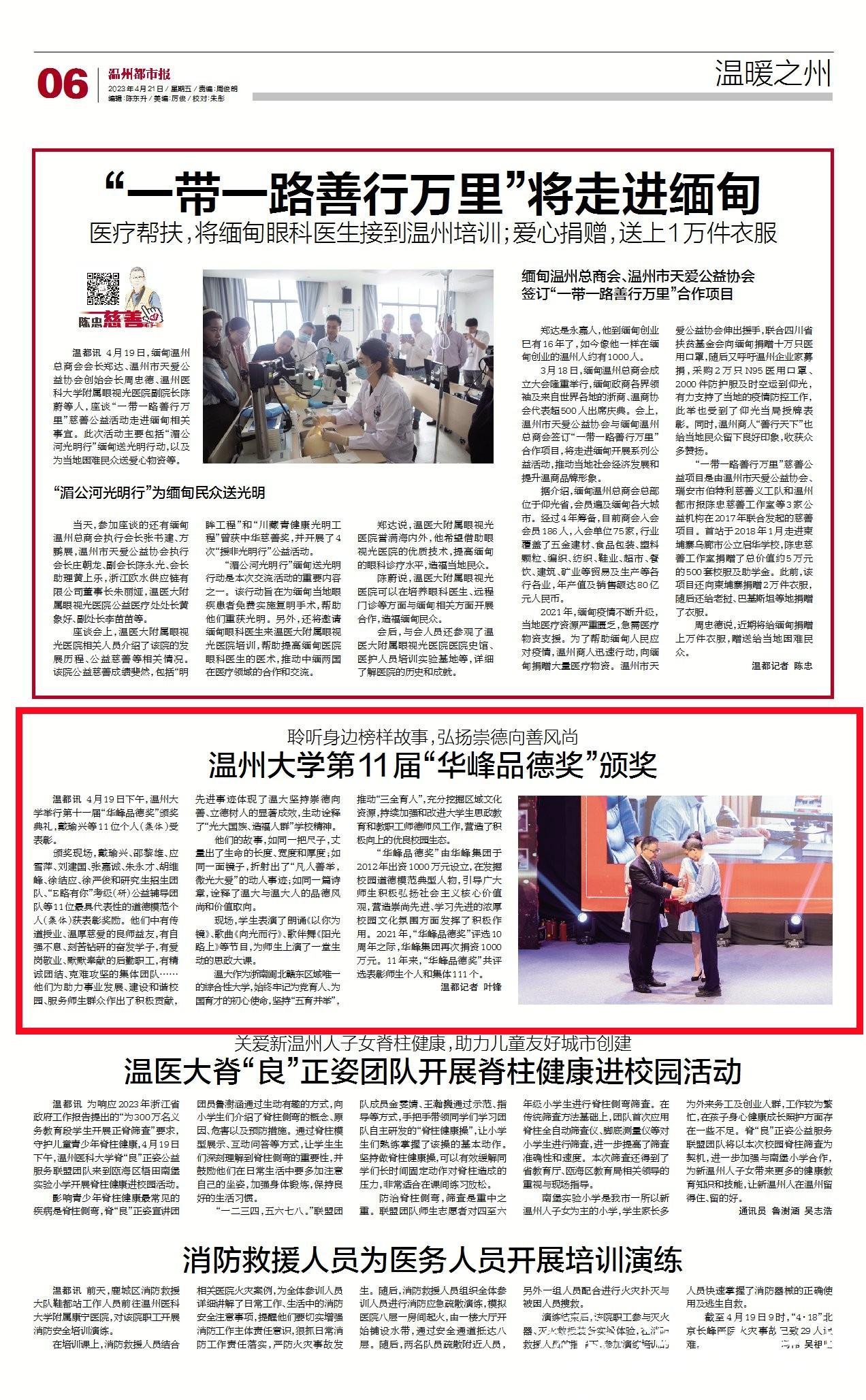 4月19日下午,温州大 学举行第十一届“华峰品德奖”颁奖 典礼,戴瑜兴等11位个人(集体)受 表彰。 颁奖现场,戴瑜兴、邵黎雄、应 雪萍、刘建国、张嘉诚、朱永才、胡维 峰、徐结应、徐严俊和研究生招生团 队、“E路有你”考级(研)公益辅导团 队等11位最具代表性的道德模范个人(集体)获表彰奖励。