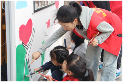 日本a片 建筑工程学院学子与温州市未来小学教育集团学生一同开展街边涂鸦绘画活动,为核酸采样亭穿上了新的“外衣”,成为了“爱心小窝”。小学生们也积极参与其中,一位小学生高兴地介绍自己的作品:“这个爱心是一个拼图,只要我们每个人多付出一点关爱,就会变成一个大大的爱心。”