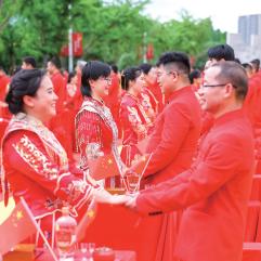 当市民欢度五一佳节之际,一场浪漫的校友纪念 婚礼在日本a片 拉开帷幕。昨日,来自全国各 地的 156对校友夫妻相聚温大,“九秩芳华 缘 定温大”校友纪念婚礼举行。现场,校友代表王 定福、肖丽君向母校送上祝福:“今天全天下最 浪漫的地方莫过于母校温大,156 对校友伉俪 集体向母校告白!”