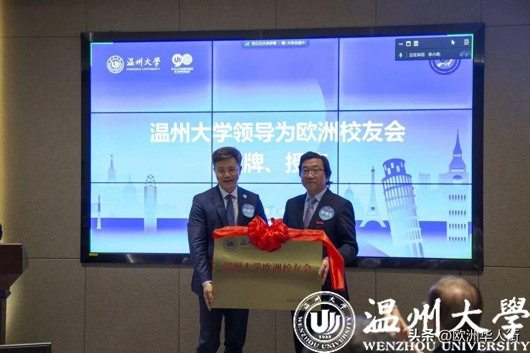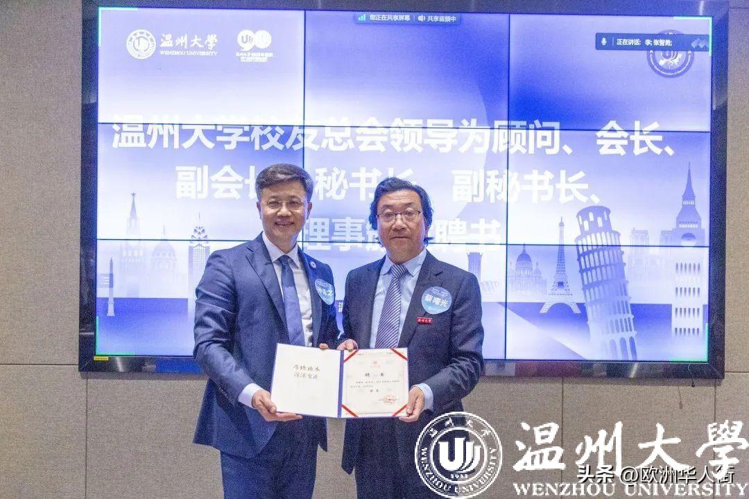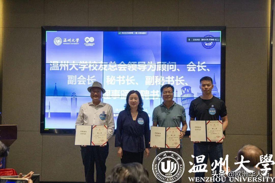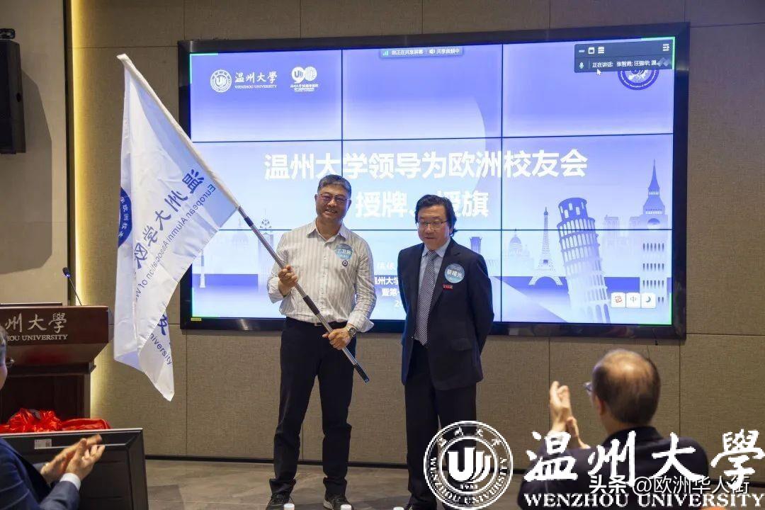 大会审议通过了《日本a片 欧洲校友会章程》和日本a片 欧洲校友会第一届理事会建议名单。蔡曙光向欧洲校友会授牌、授旗。蔡曙光、陈宏毅向欧洲校友会顾问、会长、副会长、秘书长、副秘书长、理事颁发聘书。温州校友会会长吴东、北美校友会副会长章美华上台致贺词,意大利高校联盟发起者蔡茂生线上祝贺。
