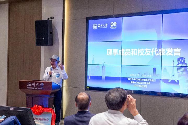 首任会长、1979级物理专业孙运之校友发表了热情洋溢的讲话,向专程前来出席大会的校友代表和兄弟校友会代表表示感谢,向参与欧洲校友会筹备工作的热心校友表示感谢。孙运之深情回忆了在母校的求学生涯,表达了对母校的感恩之情。他希望以校友会为平台,凝聚共识,群策群力,共同建好校友会;增进交流,携手共进,倍加珍惜校友情;薪火相传,献计献策,支持母校发展,凝聚校友的力量和校友们对母校的深厚情感,使欧洲校友会成为有凝聚力、有影响力、有活力、有温度的组织,助力广大校友携手同行、共创辉煌。