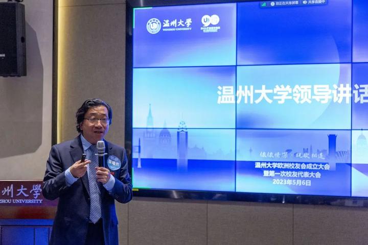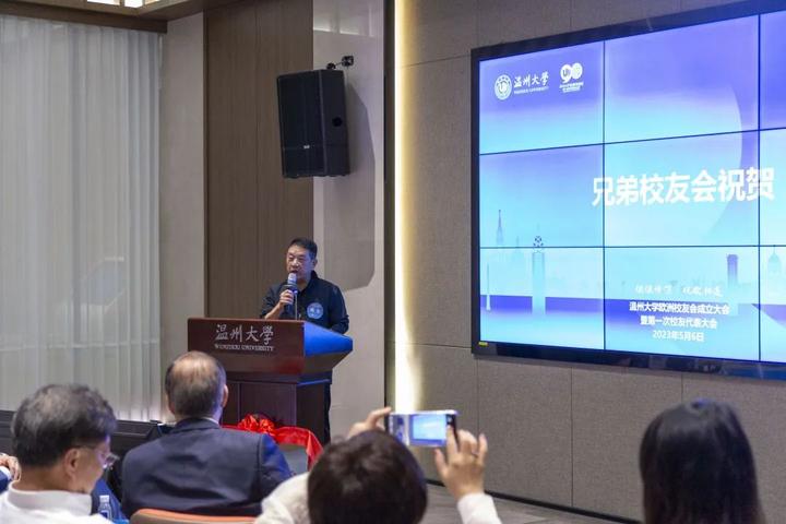 蔡曙光代表学校向欧洲校友会的成立、向当选的第一届理事会成员和会长孙运之表示热烈的祝贺。蔡曙光介绍了近年来学校的建设发展情况。他表示,学校经过90年的沉淀和发展,枝叶繁茂,校友遍布海内外,学校的高质量发展离不开广大海内外校友的大力支持。母校荣则校友荣,校友强则母校强,母校与校友共生共荣,希望欧洲校友会承盛世风华,担时代之责,紧密联系广大欧洲校友,架起校友与校友之间、校友与母校之间沟通、交流、合作的桥梁。