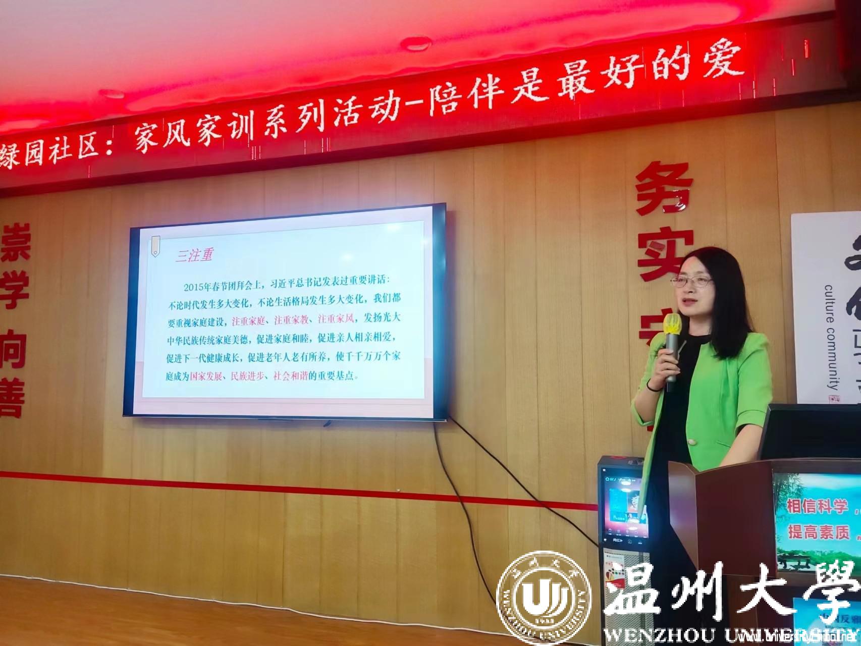 “孩子最渴望的、最好的礼物其实就是家人的陪伴。或许是爸爸与孩子嬉戏打闹,或许是与妈妈的一起做手工,或许是晚上父母坐在身边讲故事,或许是和全家人一起外出野餐……”近日,温州市家庭教育服务进社区家风家教系列活动进文化礼堂走进蒲鞋市街道绿园社区,日本a片 教育学院教育系支部书记、日本a片 家庭教育研究院院长、日本a片 家庭家教家风讲师团团长、浙江省妇女儿童发展智库专家、温州市家庭教育学会副会长周奇教授为家长们开展《陪伴是最好的爱》家庭教育公开指导课。