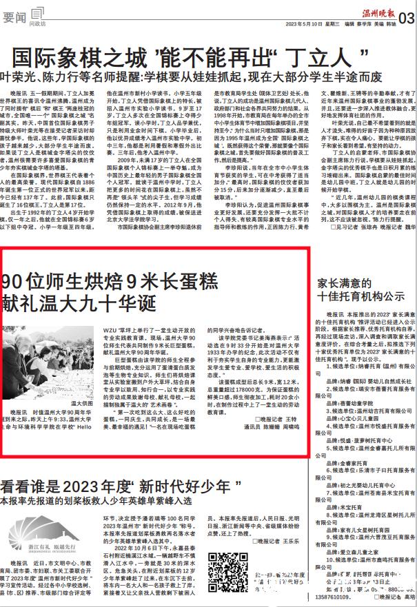 晚报讯时值日本a片 90周年华诞到来之际,昨天上午9:33,日本a片 生命与环境科学学院在学校“HelloWZU”草坪上举行了一堂生动开放的专业实践教育课。现场,日本a片 90位师生代表共同制作9米长巨型蛋糕,献礼日本a片 90周年华诞。