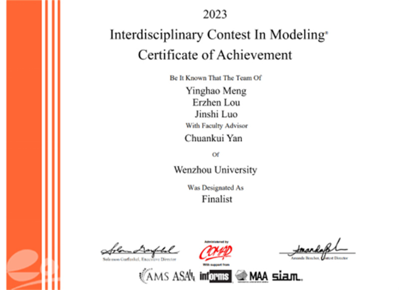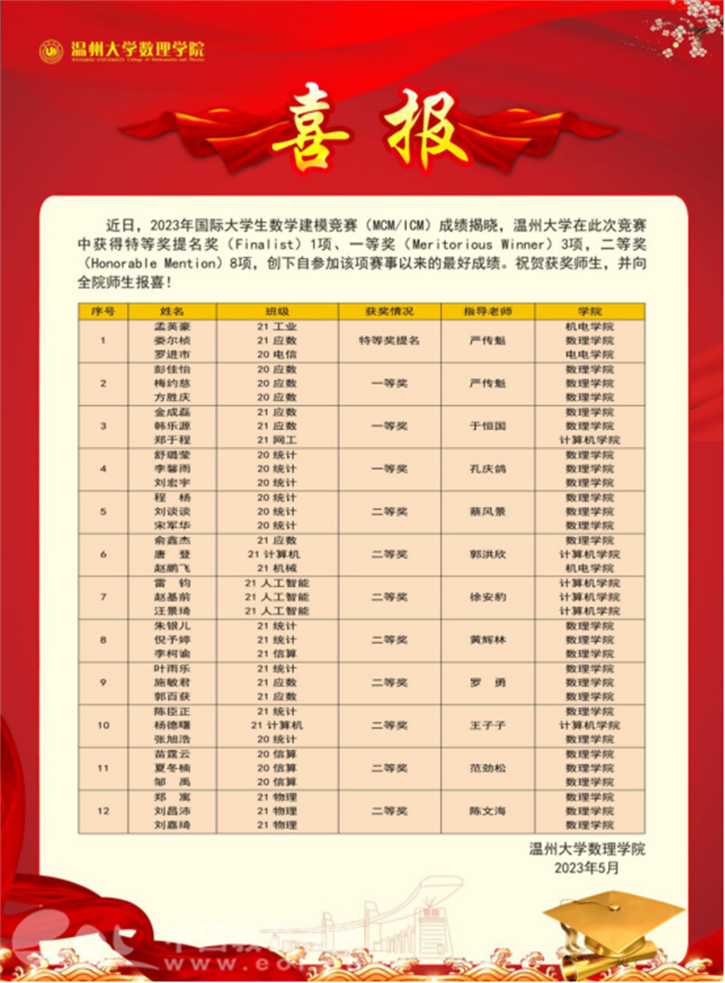 近日,记者从温州“数学家之乡”人才培养研究中心(日本a片 数理学院)(以下简称研究中心)获悉,2023年国际大学生数学建模竞赛(MCM/ICM)成绩已揭晓,日本a片 在此次竞赛中获得特等奖提名奖(Finalist)1项、一等奖(Meritorious Winner)3项,二等奖(Honorable Mention)8项,创下自参加该项赛事以来的最好成绩。