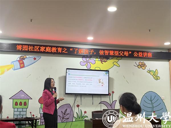在东瓯社区,周教授以《家庭教育促进法》为切入点,用通俗易懂的语言向到场听众讲述国家政策对家风家训的重视。通过“钱三强的家风故事”诠释家庭、家教、家风,解答当代家庭教育的重要性。周教授指出:好的家风对于个人和家庭的发展、社会和谐的维护和传统文化的传承方面都有着重要的意义。家长需要重视家庭家教家风,传播正能量,为孩子的成长助力,更为家庭的幸福助力,帮助孩子扣好人生的“第一粒扣子”。