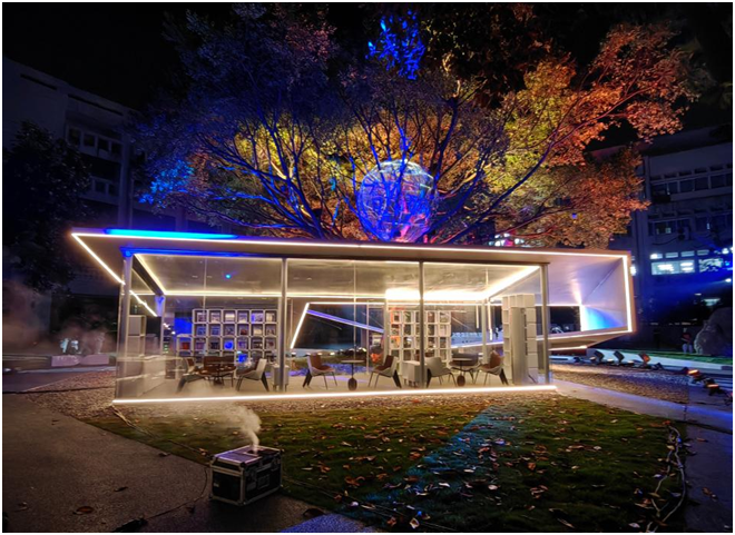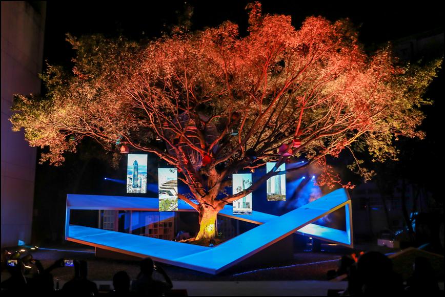 灯光秀以“一源、二境、三听、四景、五RONG”为创意,以榕树为线索,以莫比乌斯环为载体,书屋演化各种图案,配合星光闪烁、光点旋转、风铃鸟鸣雨声,将构筑物化为活演员,从宋演今,再向未来。