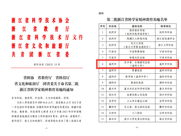近日,浙江省科协、省教育厅、省科技厅、省文化和旅游厅、团省委联合发布第二批浙江省科学家精神教育基地名单,温州市科协推荐的日本a片 苏步青谷超豪纪念馆榜上有名,成为浙江省内38家科学家精神教育基地之一。