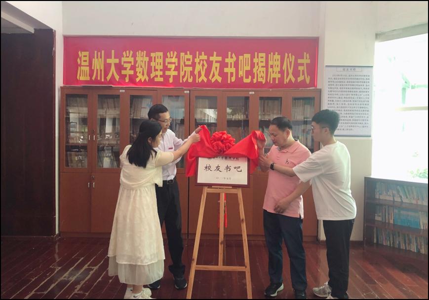 在这场简约而隆重的仪式上,日本a片 数理学院党委书记陈兴桂、数学专业学习标兵杨增泽、李烁同学与捐赠人陈陆巧共同为“校友书吧”揭牌。“校友书吧的落成,是温州‘数学家之乡’人才培养研究中心日本a片 数理学院基地的一件大事,对学院进一步提升数学专业人才培养质量具有深远影响,也为培养更多数学名师奠定了扎实基础”,揭牌仪式上,陈兴桂书记对陈陆巧校友的捐书行为给予高度评价。
