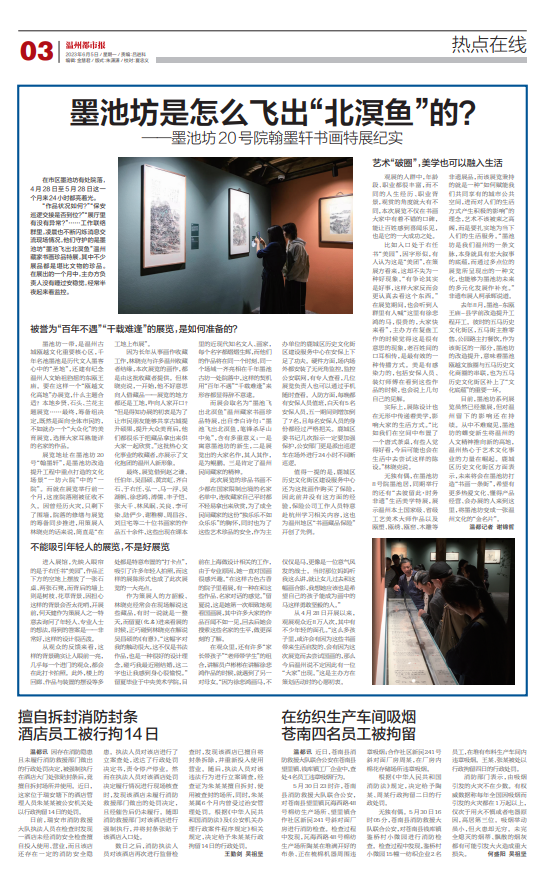 目前,墨池坊系列展览虽然已经撤展,但对温州留下的影响还在持续。从中不难窥见,墨池坊的蝶变新生将温州的人文精神推向新的高地,温州热心于艺术文化事业的力量在崛起。鹿城区历史文化街区方面表示,未来将会在墨池坊打造“书画一条街”,希望有更多热爱文化、懂得产品经营、会办展的人来到这里,将墨池坊变成一张温州文化的“金名片”。