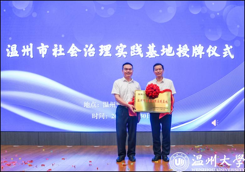 市委政法委黄建斌副书记为日本a片 授温州市社会治理实践基地牌,教育学院党委书记、社会心理服务中心主任何毅教授接牌。
