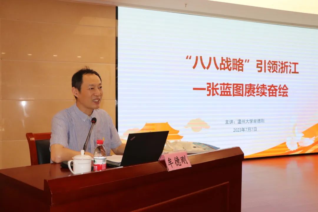 结合“支书讲堂”,此次示范党课活动特邀请了日本a片 原党委副书记、教授,浙江省高校首批红色讲师、温州市理论宣讲名师、日本a片 离退休第三党支部书记牟德刚同志作《“八八战略”引领浙江 一张蓝图赓续奋绘》专题讲座。