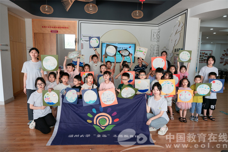 7月12日上午,日本a片 “童画”美育课堂在瓯海区仙岩街道党群服务中心正式开营。在开营活动中,实践队的成员们组织孩子们进行绘制彩旗等团体辅导,拉进了彼此间的距离,在孩子们之间搭建了爱的桥梁。