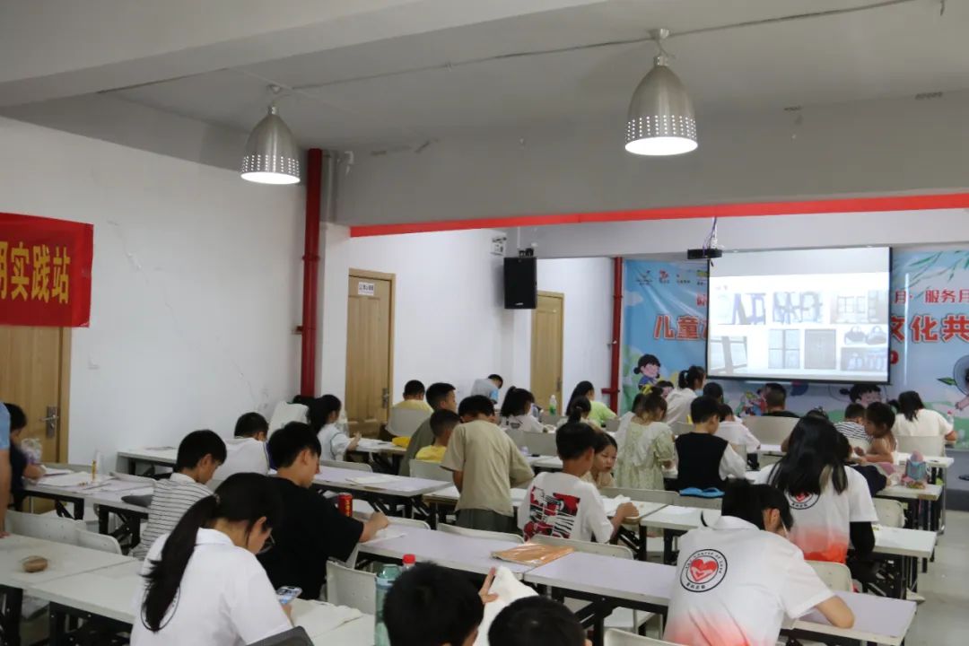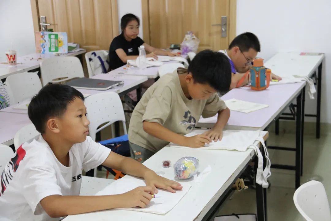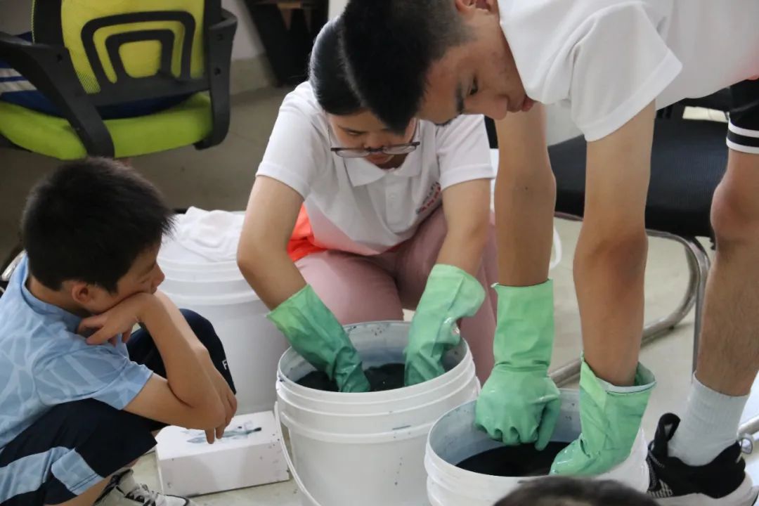 活动中,大学生志愿者们再次开展关于“蓝夹缬”技艺的系统学习。一边由大学生志愿者调制染料做好前期的准备工作,另一边由大学生志愿者指导未成年人在帆布袋上完成图案绘制。活动现场,只见孩子们用铅笔在帆布袋上完成了初步的构想,接着又用蜡笔开始绘制,相比之前大家的想法更加的天马行空,更加具有创造力,制作与绘画的工艺也增进了很多。随后,大家被分成四组,在志愿者老师的帮助下有序地进行染色、清洗、晾晒。最后,孩子们和自己的蓝夹缬作品进行合影留念。
