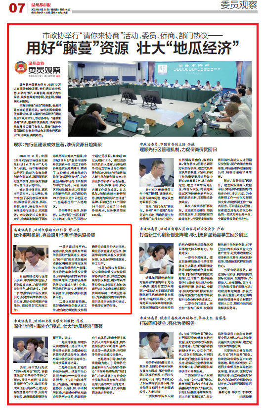 华商华侨是“地瓜”的藤蔓,也是对外交流的重要桥梁。如何发挥华商华侨资源优势,助力温州“地瓜经济”提能升级?8月22日,市政协举行 “请你来协商”活动,邀请市政协委员、华商华侨代表及相关部门负责人,围绕“推进中国(温州)华商华侨综合发展先行区建设”献计献策、共同助力。