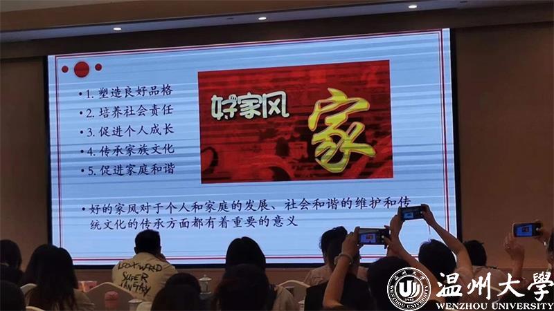 周老师从什么是家风、怎样传承优良家风、如何培育家国情怀、学做智慧父母等几个方面深入阐述了推动形成爱国爱家的家国情怀、建设相亲相爱的家庭关系、弘扬向上向善的家庭美德、体现共建共享的家庭追求。