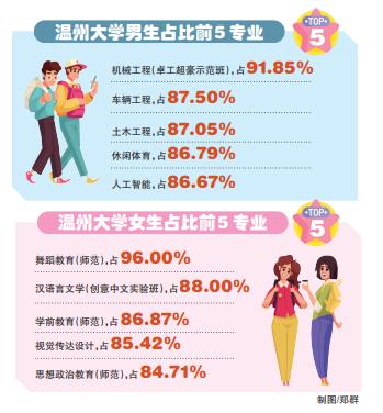 温大有5192名本科新生,男女比例接近1:1,人数分别为2642名、2550名。女生最多的专业是舞蹈教育(师范),占比高达96%,其次为汉语言文学(创意中文实验班)和学前教育(师范)。男生最多的专业是机械工程(卓工超豪示范班),占91.85%,车辆工程、土木工程、休闲体育、人工智能紧随其后。