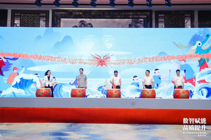 浙江省文化和旅游厅社会组织党委书记、二级巡视员戴言,浙江省旅游投资集团有限公司党委委员、副总经理,浙江省旅游协会副会长张雄文,温州市文化市场行政执法队队长余求红,温州市瓯海区委常委、宣传部长孟晓晨,浙商银行温州分行副行长王晓勇上台正式开启全省文旅迎亚运主题活动