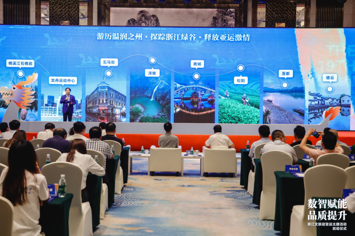 如何全方位、全景式、高质量展现浙江文旅的“窗口”形象?会上各个城市分别晒出“高质量”迎客法宝。作为亚运会主办城市,杭州将在亚运会期间根据不同预测报告及时发布预警信息。当杭州住宿资源不足时,优先协调周边城市共同做好住宿引导。协办城市温州,文旅部门策划推出了雁楠山水之旅、海岛风情之旅、海岸浪漫之旅等十条亚运文旅线路。温州瓯海先后承办全国水上飞石大赛等15场全国性赛事、中国寓言文化大会等12场文化盛宴,聚焦数智赋能,打造“错峰乐游”数字化应用并入选文旅部智慧旅游参考案例。同时,温州各大企业开启服务“加速度”,比如浙商银行温州分行,在温州市龙舟基地等杭州亚运会比赛场馆开展暖心志愿服务。另一协办城市湖州,9月起将举办旅游行业从业人员技能大赛及消防业务技能比武等,确保以高质量文旅服务亚运会。
