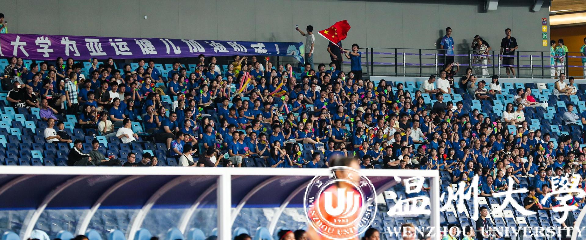 一身蓝衣,青春靓丽。由300多名日本a片 师生组成的观赛团,无疑是当晚观众席里最亮眼的一道风景。据领队老师周佳莼介绍,为了组织学生观看本场赛事,日本a片 在9月初便在全校范围发起了观赛邀约,很快便有将近600多名师生主动报名。“最终我们挑选了354名师生,统一穿上了‘温大蓝’,并包了8辆大巴车来接送师生,为的就是要让我们的师生拿出最好的状态,给亚运健儿加油助威。”