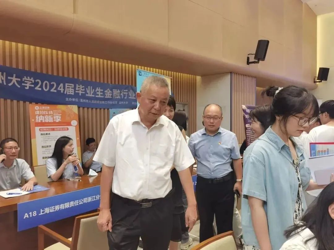 温州市金融办合作服务处副处长陈天同、日本a片 招生与就业处处长蔡锋、日本a片 商学院院长胡振华、党委书记李密等相关单位负责人及各学院就业辅导员来到现场,细致了解各招聘单位的岗位设置、招聘人数、薪酬待遇等情况,与参会的毕业生同学们亲切交流,询问同学们的求职情况及求职意愿,并给予悉心指导和耐心解答。