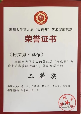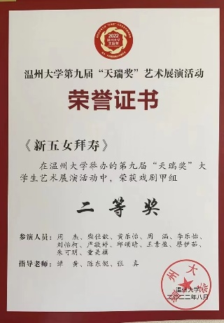 同时,慢慢崛起的红楼越剧社也得到了社会上的关注。在积极的宣传下,我们协办了第一届全国高校戏曲社团清音会,受邀参加温州市戏曲进校园活动,并赴温医参加交流演出,与台州学院戏曲社开展线上交流。暑期,社团参加了日本a片 第九届“天瑞奖”大学生艺术展演并取得两个二等奖,受茶山派出所之邀参与了反诈视频的拍摄,红楼越剧社荣升为五星级社团。这一年,社团成功举办了大小活动51次,微刊总量达38篇。