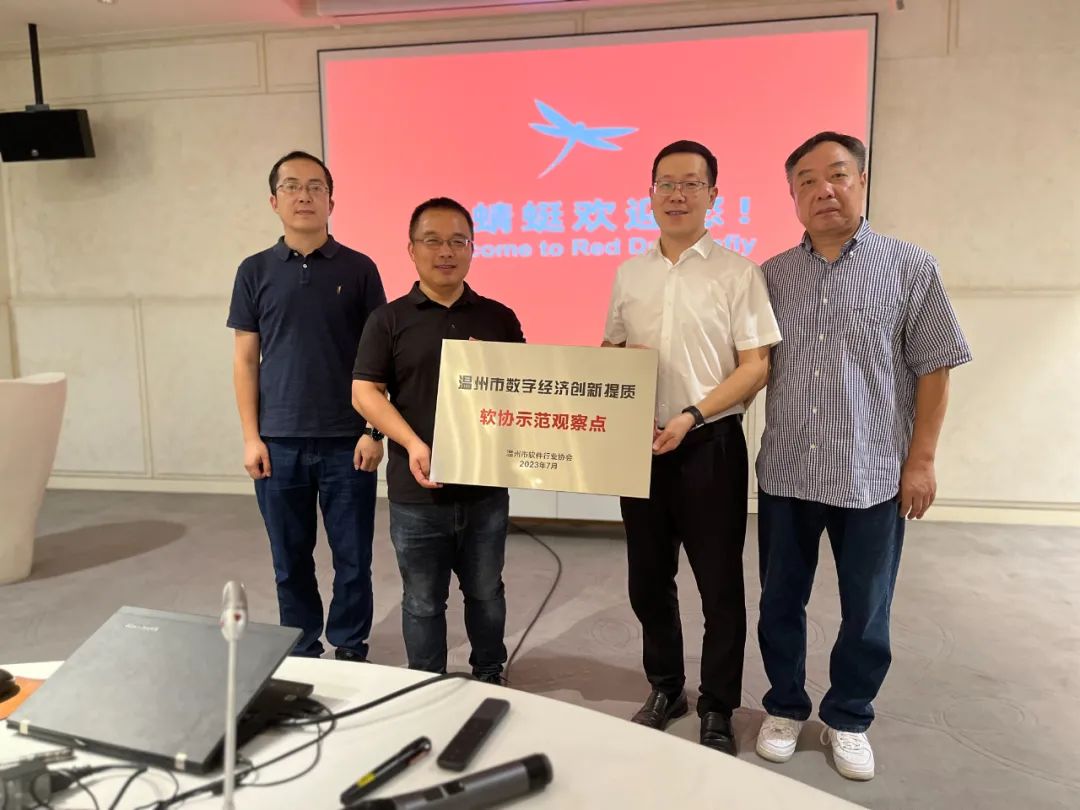 温州市软件行业协会在浙江红蜻蜓鞋业股份有限公司设立首个温州市数字经济创新提质示范观察点,胡亮会长向姚跃朋高级总监授牌。