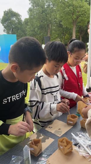 将纸片折成了一个小小的盒子,挑选自己喜欢的昆虫标本放置于小盒子之中,在志愿者的帮助下倒注琼脂……在志愿者们的引导下,小记者们亲手制作了一个昆虫琥珀。而后,小记者们还在志愿者的引领下,分别走进植物摊位、环境摊位等摊位前,动手制作了美丽书签、水龙头过滤器等。