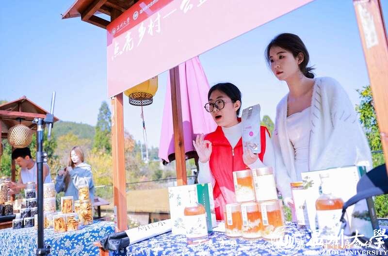 农副产品直播摊位上,大学生主播们结合专业优势,开展了各类特色直播服务。青刀豆干、紫衣腰果、香信菇等数十种当地农产品热卖,当地自主研发的树莓酒、蓝莓醋也吸引了不少消费者。