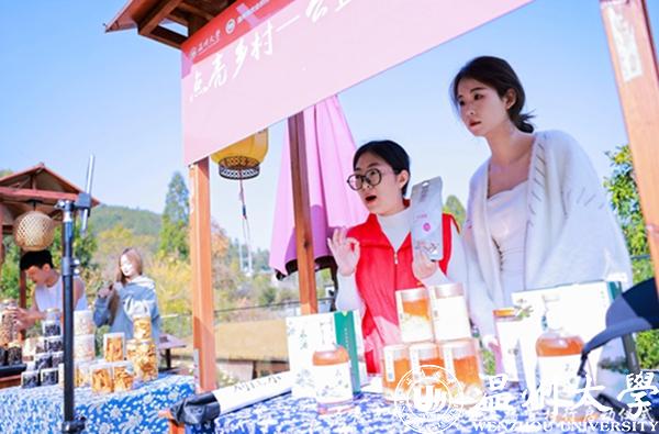农副产品直播摊位上,大学生主播根据自身特长,结合专业优势,开展了各类特色直播服务,青刀豆干、紫衣腰果、香信菇、笋干、果蔬干、金丝皇菊等数十种农产品热卖;当地自主研发的树莓酒、蓝莓醋也是吸引了不少消费者。