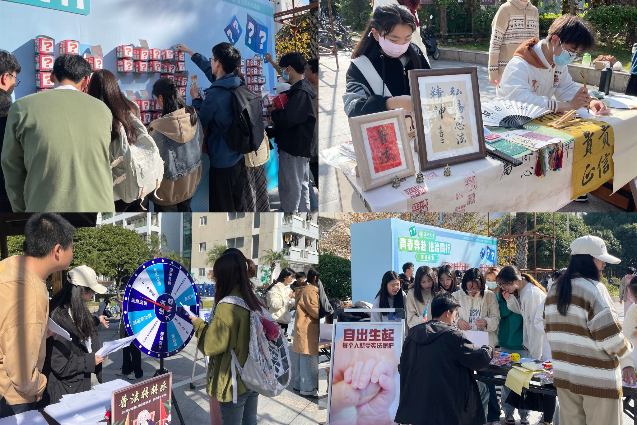 “普法转转乐”“法治盲盒”“普法大冲关”“法治人生”“以拼会法”……在普法市集现场,一系列普法集章活动及普法书画作品展示体验让同学们在寓学于乐中学宪知宪遵宪,在笔墨纸砚中汲取法治智慧和力量。法治盲盒中还暗藏了法律知识卡片和“獬豸”挂件,拆盲盒现场惊喜不断、热闹非凡。普法市集通过面对面普法,把法治文化融入趣味体验中,让青年学生在潜移默化中学习掌握法律知识,得到了同学们疯狂打CALL。