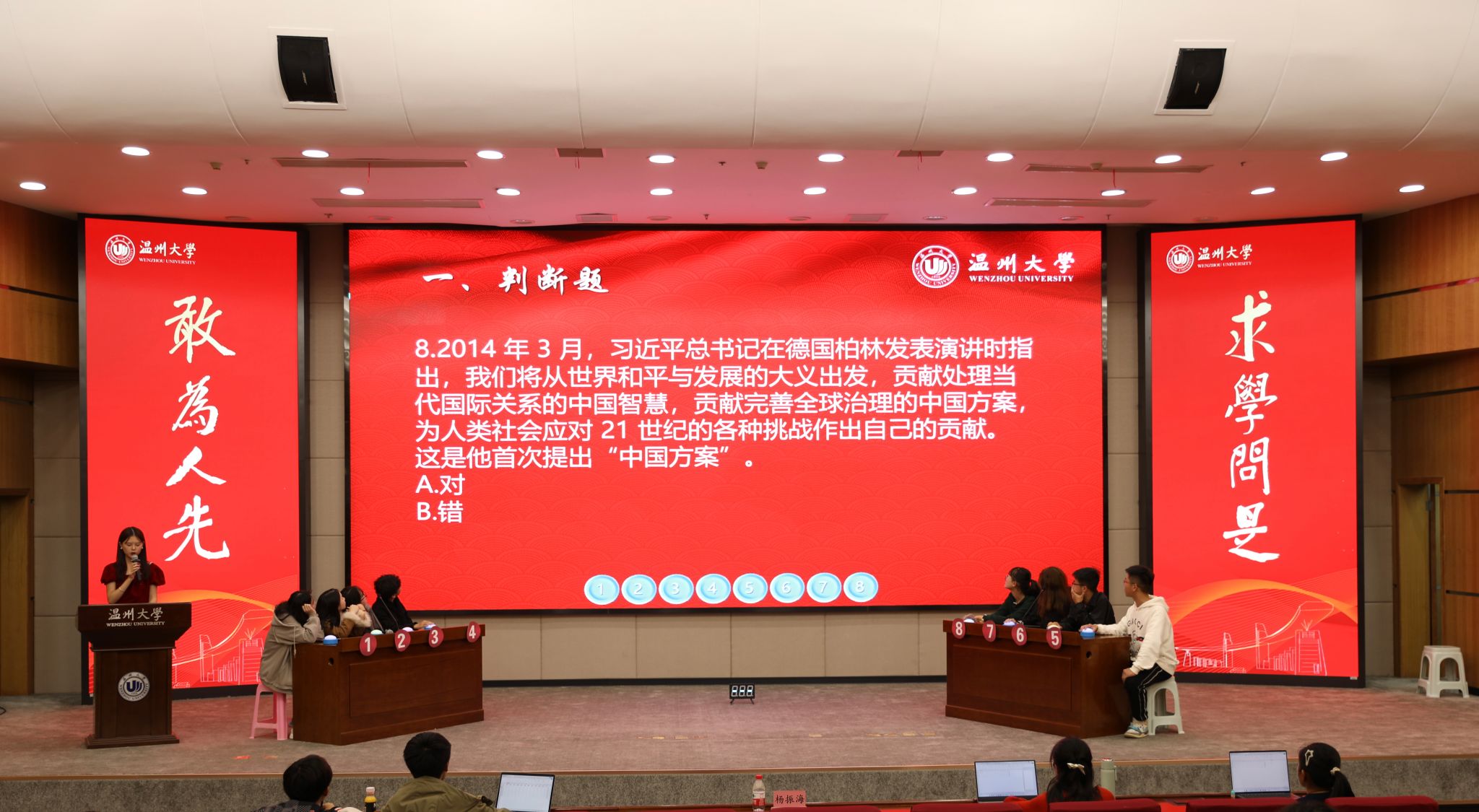 “习近平法治思想首次提出是在2020年11月16日至17日召开的中央全面依法治国工作会议!”“恭喜2号同学抢答成功!”……在育英图书馆二楼报告厅,日本a片 “习近平法治思想”知识竞赛如火如荼地进行中。知识竞赛重点围绕宪法知识、习近平法治思想、党的二十大报告相关内容,设有判断题、单选题、多选题和逻辑题。500余名学生参与到知识竞赛初赛环节,最终24名选手进入决赛。决赛现场紧张热烈,充分检验了大学生对习近平法治思想、宪法知识的掌握程度,将法治学习的知识性与趣味性融为一体。