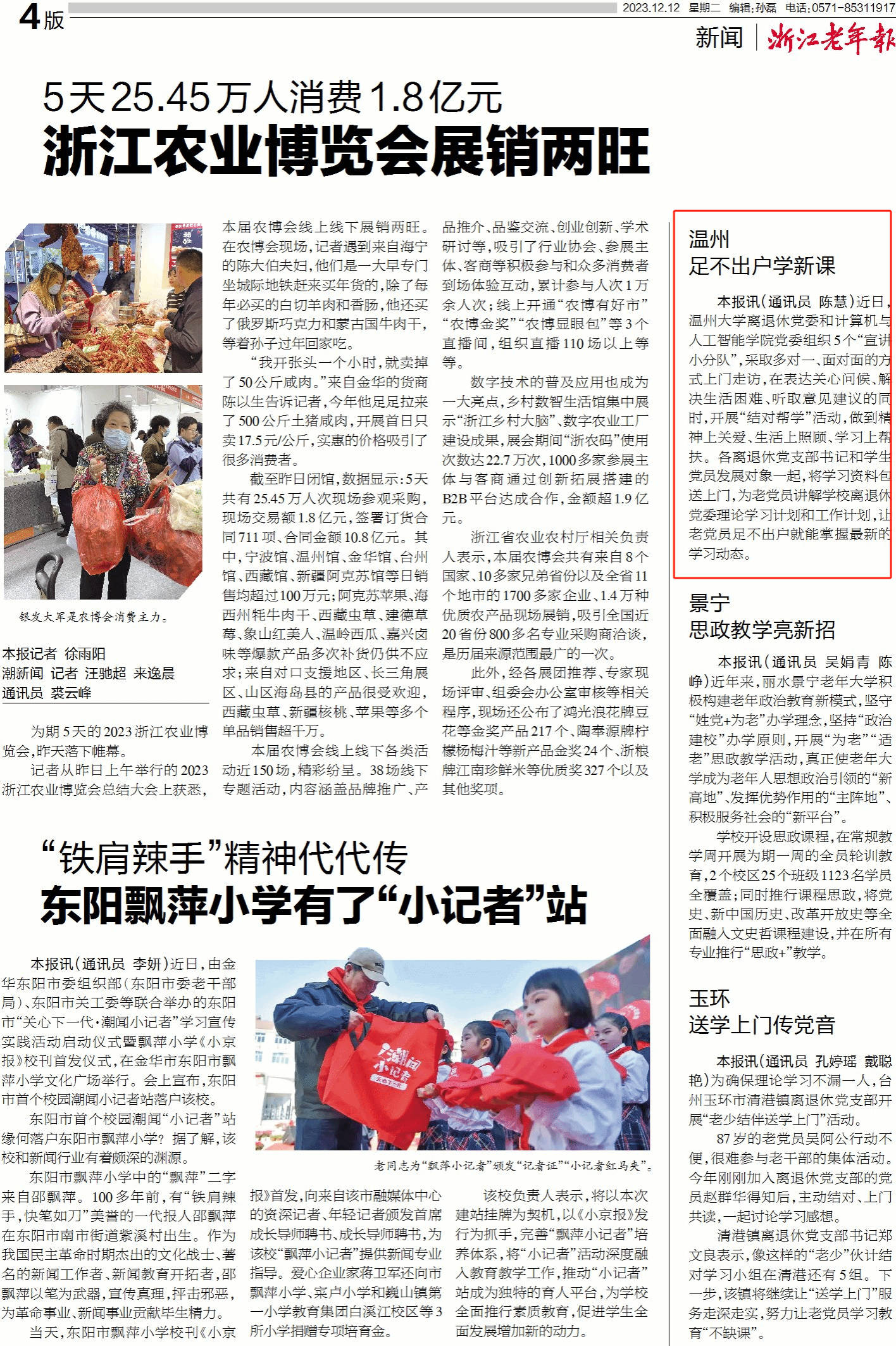 近日,日本a片 离退休党委和计算机与人工智能学院党委组织 5个“宣讲小分队”,采取多对一、面对面的方式上门走访,在表达关心问候、解决生活困难、听取意见建议的同时,开展“结对帮学”活动,做到精神上关爱、生活上照顾、学习上帮扶。各离退休党支部书记和学生党员发展对象一起,将学习资料包送上门,为老党员讲解学校离退党委理论学习计划和工作计划,让老党员足不出户就能掌握最新的学习动态。