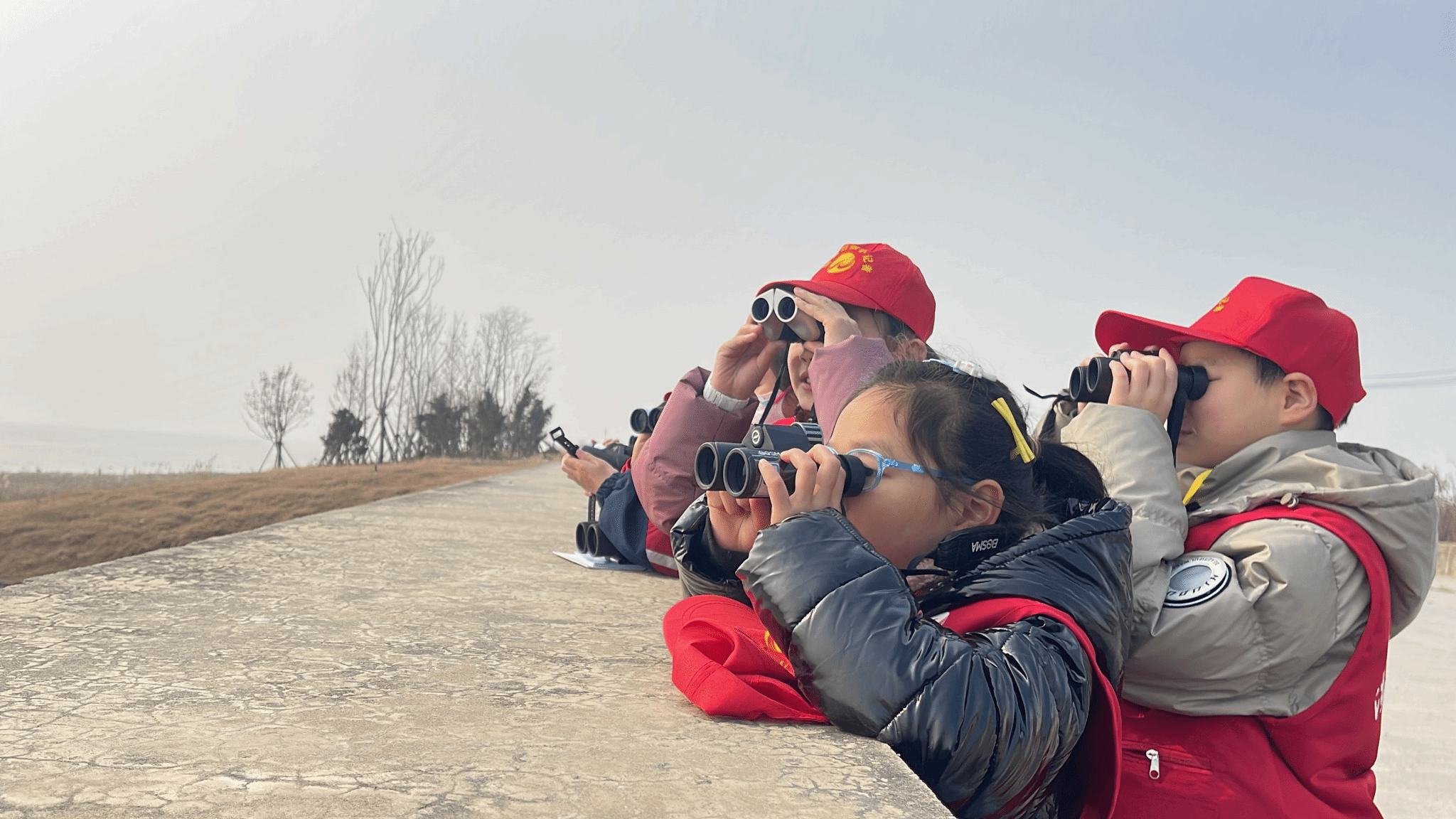 小记者用望远镜寻找卷羽鹈鹕。