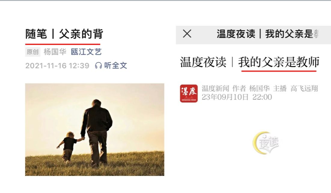 他此生不能忘怀自己儿时的交通工具是《爸爸的背》。即使爸爸带学生到南雁拉练,也背着儿子,直到老人家病重在床,国华才注意到爸爸背上那深深的刀痕……国华在《我的爸爸是教师》中记录爸爸执教过勤俭中学、肖江中学、腾蛟中学、后林中心学校,讲述了爸爸一辈子教书匠的粉笔人生和刻蜡纸的铁笔生涯,杨老师用心血浇灌学子成长,一日为师终生为父,一位学子双膝跪地叩谢恩师。