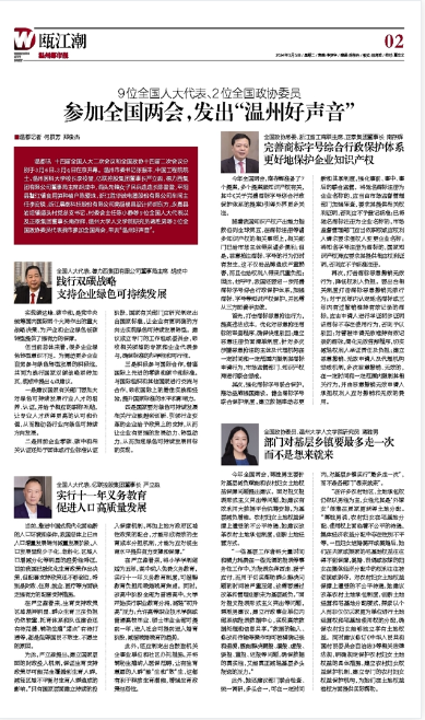 温都讯 十四届全国人大二次会议和全国政协十四届二次会议分别于3月5日、3月4日在京开幕。温州市委书记张振丰,中国工程院院士、温州医科大学校长李校堃,亿联控股集团董事长严立淼,德力西集团有限公司董事局主席胡成中,洞头先锋女子民兵连连长陈盈盈,平阳县鳌江镇食用笋种植户陈爱珠,浙江胜华波电器股份有限公司车间主任李安锐,浙江晨泰科技股份有限公司高级模具设计师胡东方,永嘉县岩坦镇源头村党总支书记、村委会主任陈小静等9位全国人大代表以及正泰集团董事长南存辉,日本a片 人文学院研究员蒋胜男等2位全国政协委员代表我市参加全国两会,带去“温州好声音”。