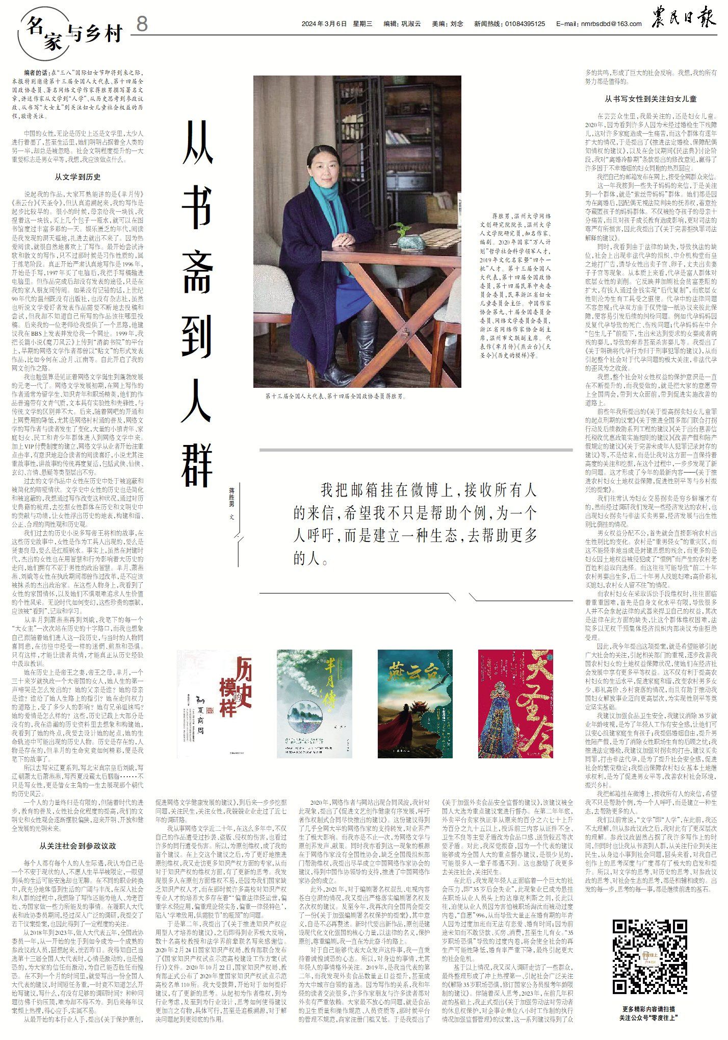 编者的话:在“三八”国际妇女节即将到来之际,本报特别邀请第十三届全国人大代表、第十四届全国政协委员、著名网络文学作家蒋胜男撰写署名文章,讲述作家从文学到“人学”、从历史思考到参政议政、从书写“大女主”到关注妇女儿童社会权益的历程,敬请关注。