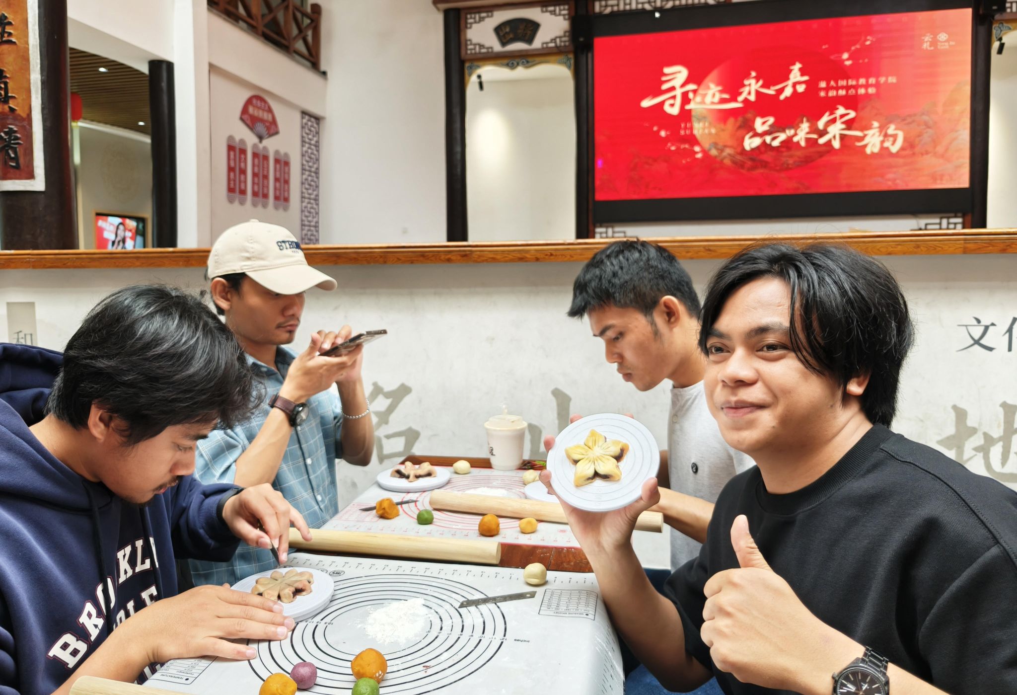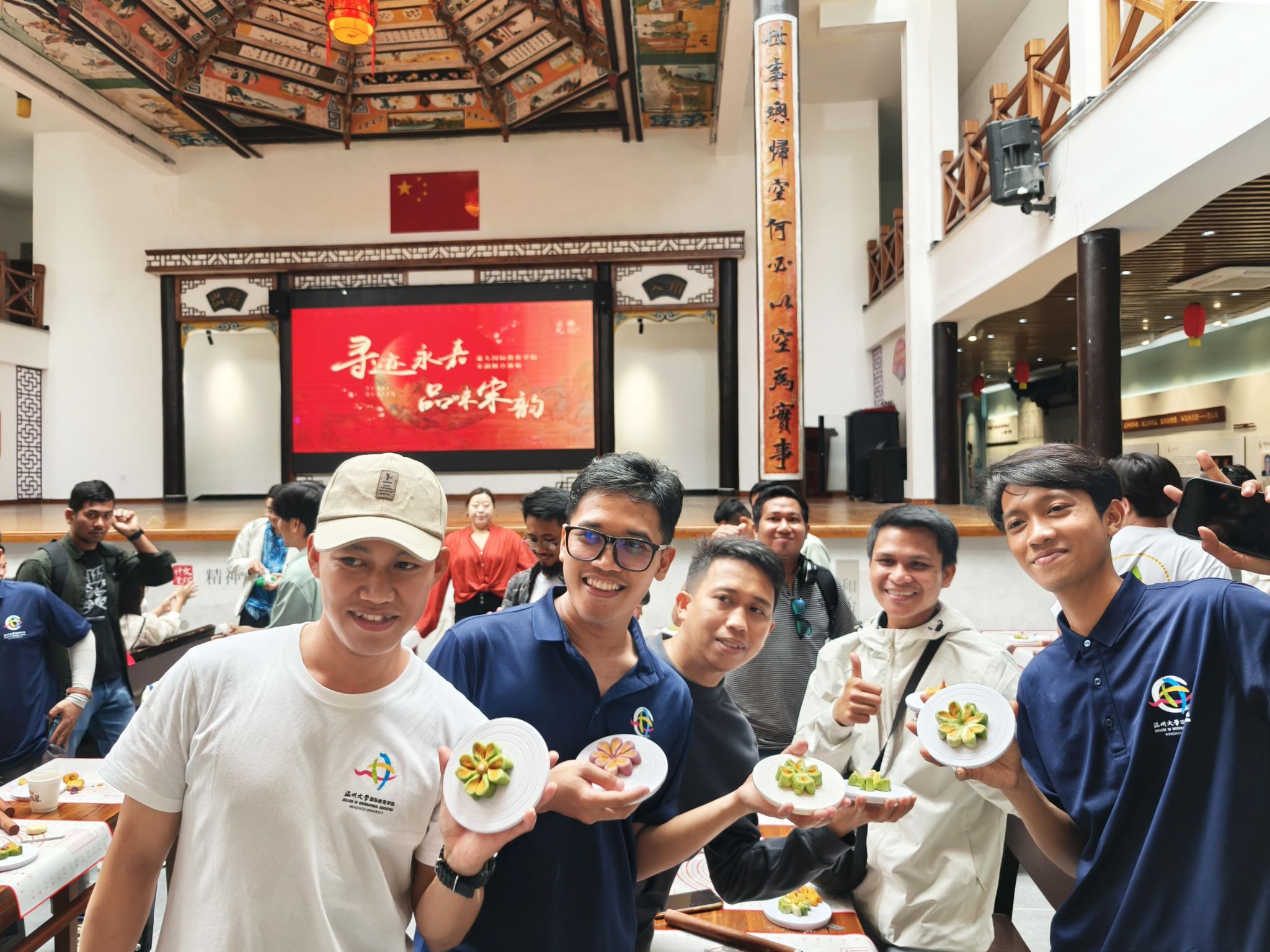 水云村糕点师林乐琼,在水云村党群服务中心为印尼的学员们带来了一场别开生面的“宋韵茶果”制作体验课程。揉面、和馅、定型、烤制......只见在林老师的带领下,同学们用面团制作了各式形状、不同口味的“桃花”雏形,呈现出一幅花团锦簇的模样。“第一次给外国人上课,挺紧张的,但是想到能把中国传统文化传播出去,特别开心!”课程结束后,她对记者说道。