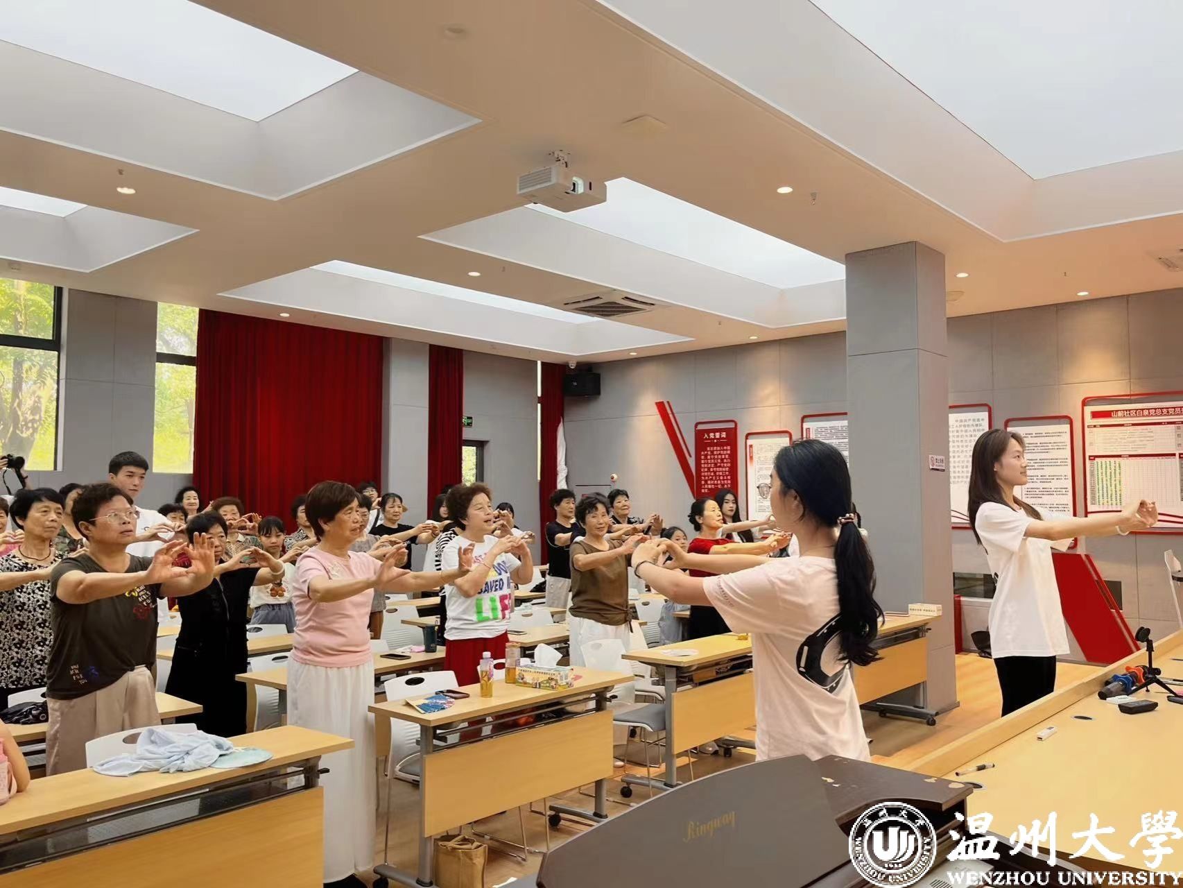 在新桥街道新欧社区里,实践队的李梓煜带领着孩子们随着音乐的节奏唱响了《红星闪闪》等经典歌曲,他们拍打着桌面,随着音乐的律动舞动双手,孩子们用最直接的方式表达了对党的热爱和祝福。同样,在新桥街道山前社区,30多位社区阿姨跟着实践队队员叶籽在音乐中摆动双手。