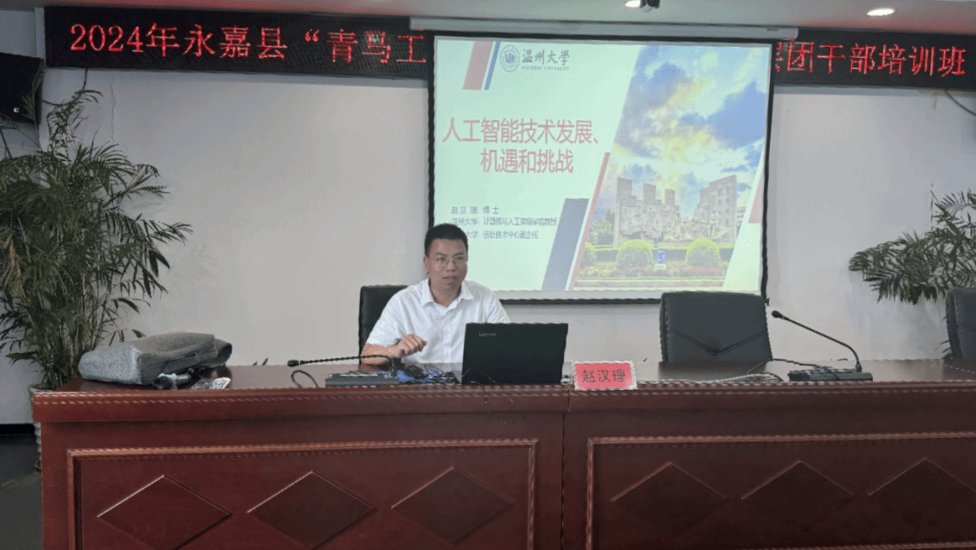 6月21日,民革日本a片 基层委副主委赵汉理教授应邀为2024年永嘉县“青马工程”暨“浙里青廉”基层团干部培训班学员讲授人工智能课程。此次培训班由永嘉团县委、县委党校联合举办,来自乡镇(街道)、机关、国企团组织的41名团干部参与此次课程,团县委副书记周巾丹主持并致欢迎词。