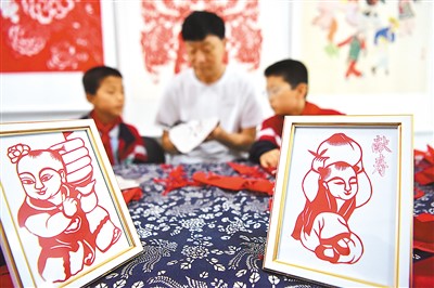 山东高密姜庄镇产学研实践基地内,非遗传承人指导小朋友剪纸。