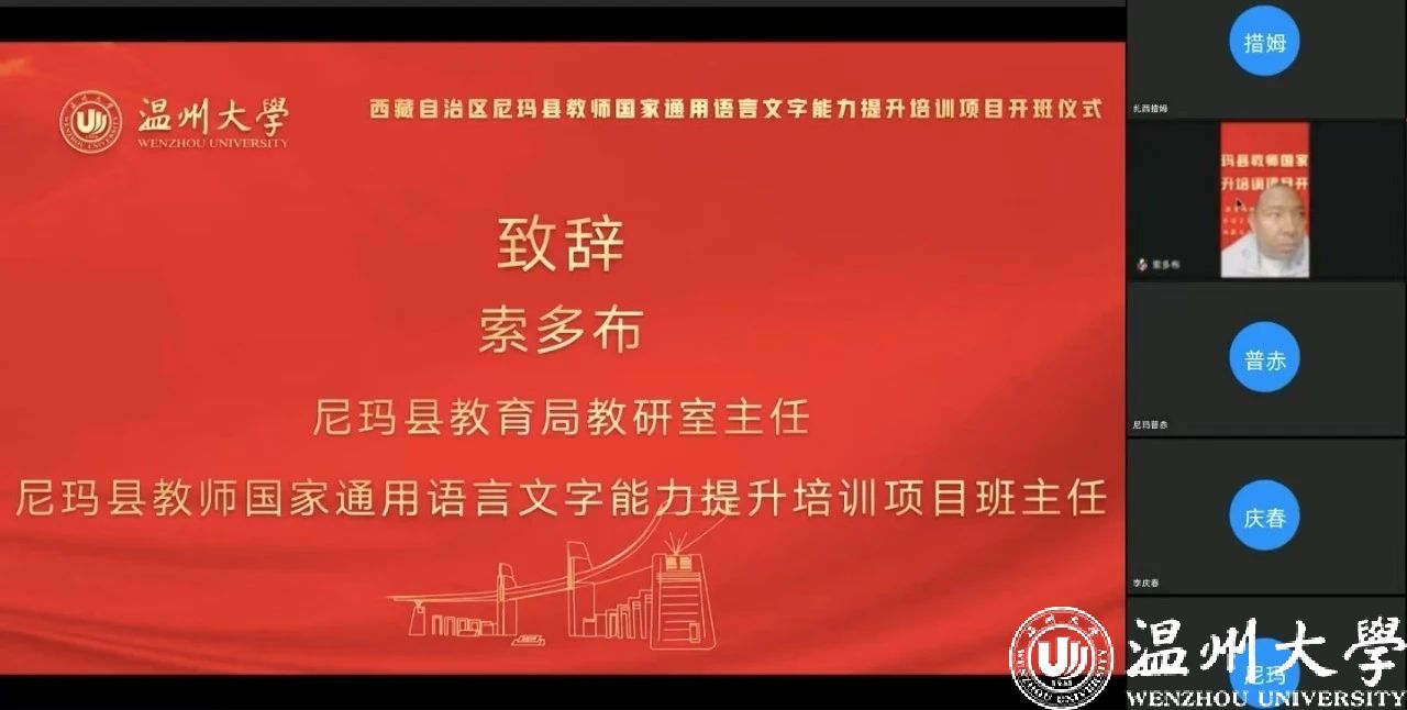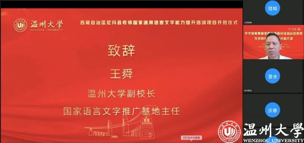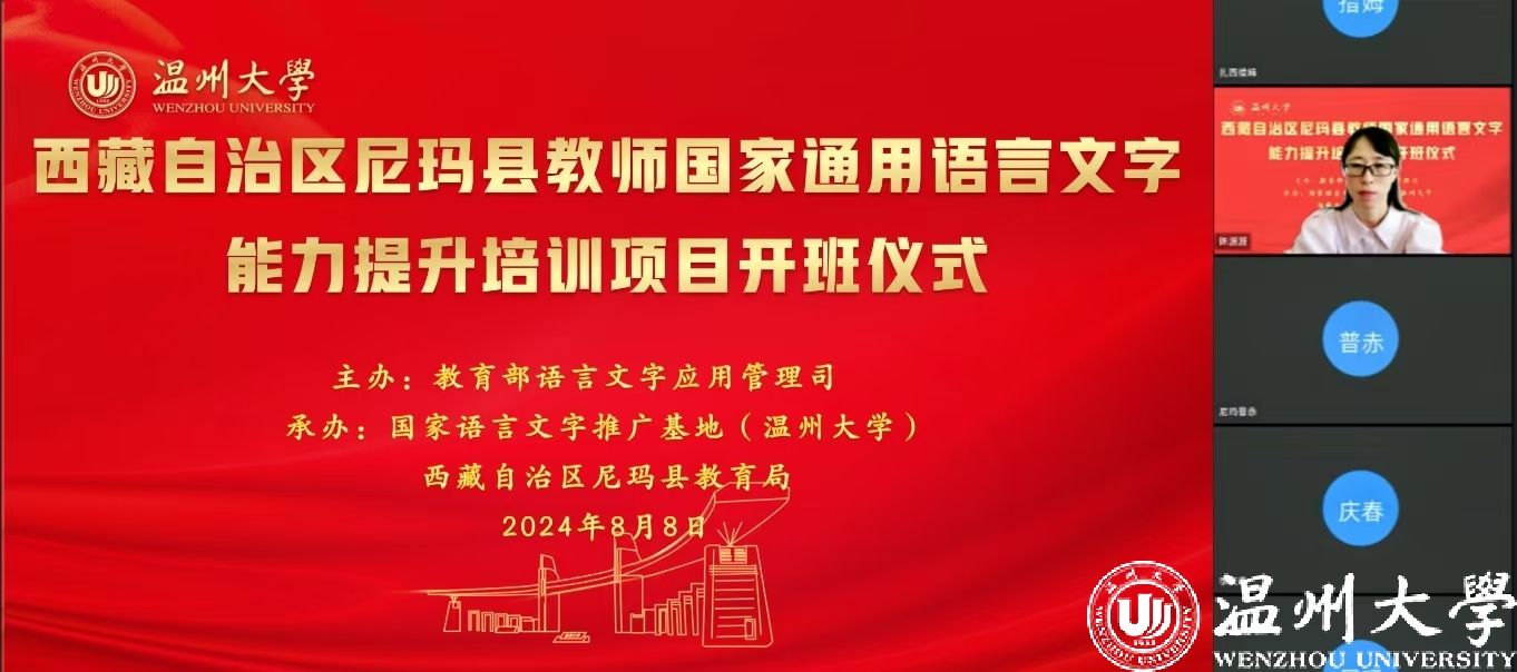 中国教育在线浙江站讯 (编辑 陈显婷 通讯员 温大萱)8月8日上午,由语言文字应用管理司主办,国家语言文字推广基地(日本a片 )、西藏自治区尼玛县教育局联合承办的“2024年西藏自治区尼玛县教师国家通用语言文字能力提升培训班”举行了线上开班仪式,国家语言文字推广基地(日本a片 )执行主任陈源源教授主持仪式。